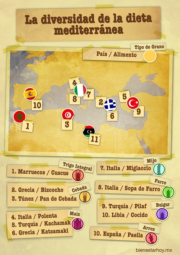 Cuando hablamos de la dieta mediterránea, hablamos de la gastronomía y la cultura de once países, como España, Italia, Turquía, Libia, Grecia, entre otros. Está conformada por platos sencillos, nutritivos y coloridos. Cuenta con una amplia variedad de granos y alimentos con ácidos grasos Omega 3 y es baja en carnes rojas, azúcar y grasas. Además, incluye todos los grupos de alimentos básicos para tener una vida saludable, centrándose en: