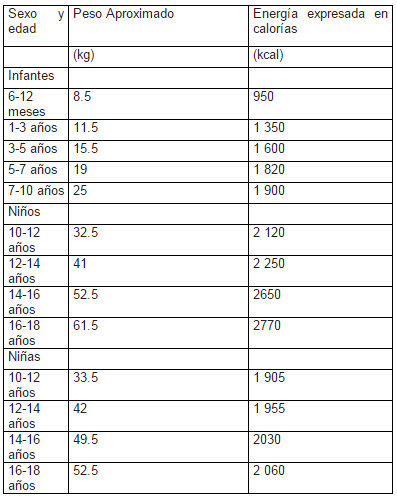 Si bien el número de calorías o la cantidad de energía que requieren los niños depende de su edad, sexo y actividad física, la Organización de las Naciones Unidas para la Alimentación y la FAO comparten los requerimientos de energía para los niños: