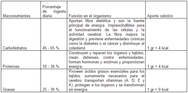 La FAO propone una dieta equilibrada que incluye carbohidratos, proteínas y grasas. Estos se conocen como macronutrientes porque son sustancias que se requieren en grandes cantidades para las funciones fisiológicas naturales del cuerpo. Los micronutrientes se requieren en pequeñas cantidades y son las vitaminas, los minerales y otros fitonutrientes.