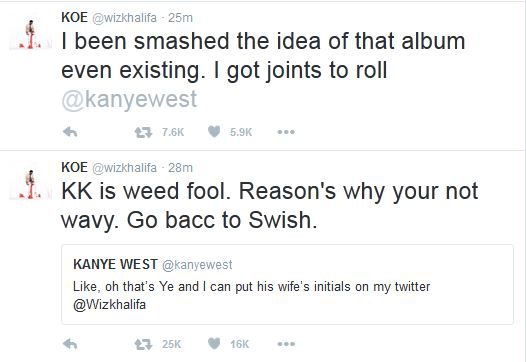 “Voy a fumar esta KK”, escribió Khalifa, y West le recriminó que no escribiera las iniciales de su mujer. Sin embargo, Khalifa se refería a un tipo de marihuana a la que auspicia.