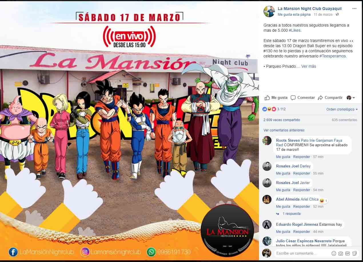 Un night club de Guayaquil (La Mansión) confirmó que transmitiría el capítulo de Dragón Ball Súper por su aniversario. Lanzó el comunicado tras realizar una campaña de me gustas a través de Facebook.