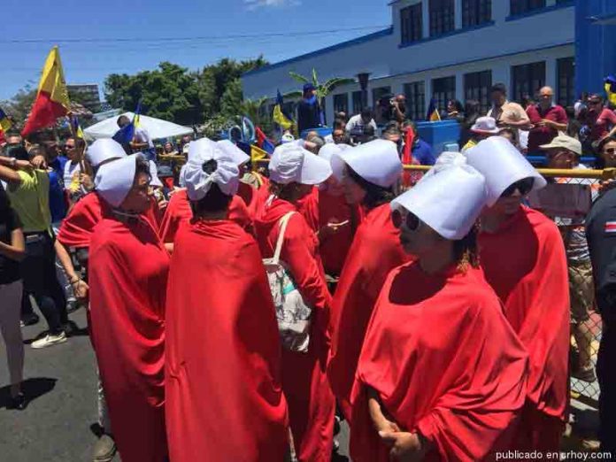 La vestimenta está basada en el libro El Cuento de la Criada, una narración feminista de la escritora canadiense Margaret Atwood.