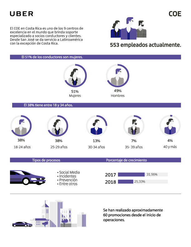 Además, Uber reafirma su apuesta por Costa Rica como un centro importante para establecer negocios. En ese sentido, recordó que el Centro de Excelencia ubicado en una Zona Franca es uno de los 9 Centros de Excelencia en el mundo que brinda soporte especializado a socios colaboradores y clientes. Desde San José se da servicio a todo Latinoamérica, excepto a Costa Rica y ha generado 533 empleos directos.