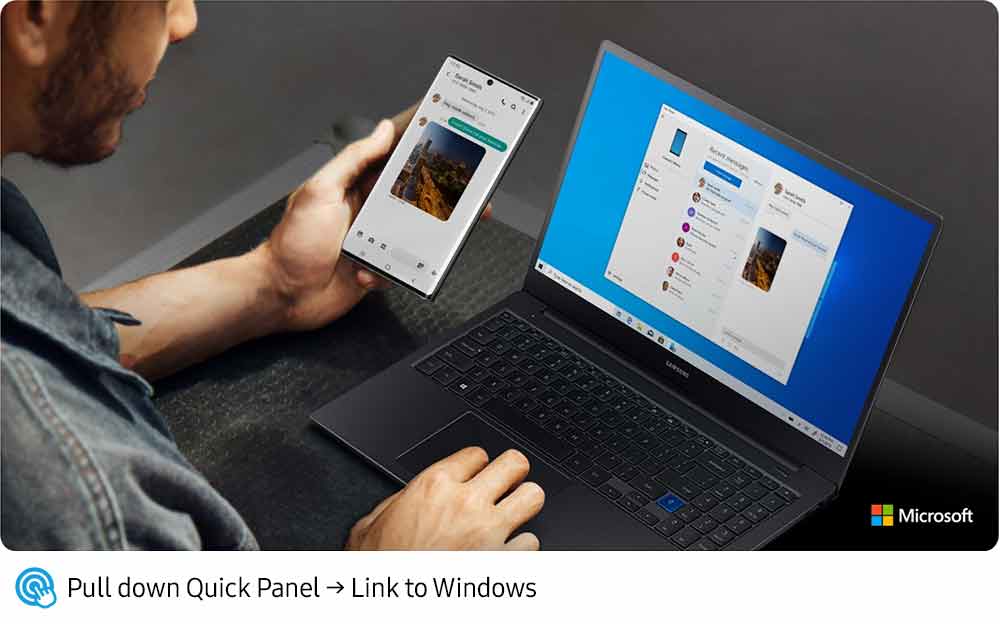 Link to Windows se puede iniciar a través del Panel rápido o de Configuración > Funciones avanzadas. Una vez que el usuario inicia sesión en su cuenta de Microsoft, el Galaxy Note10 se vincula automáticamente a su PC. Así de fácil.