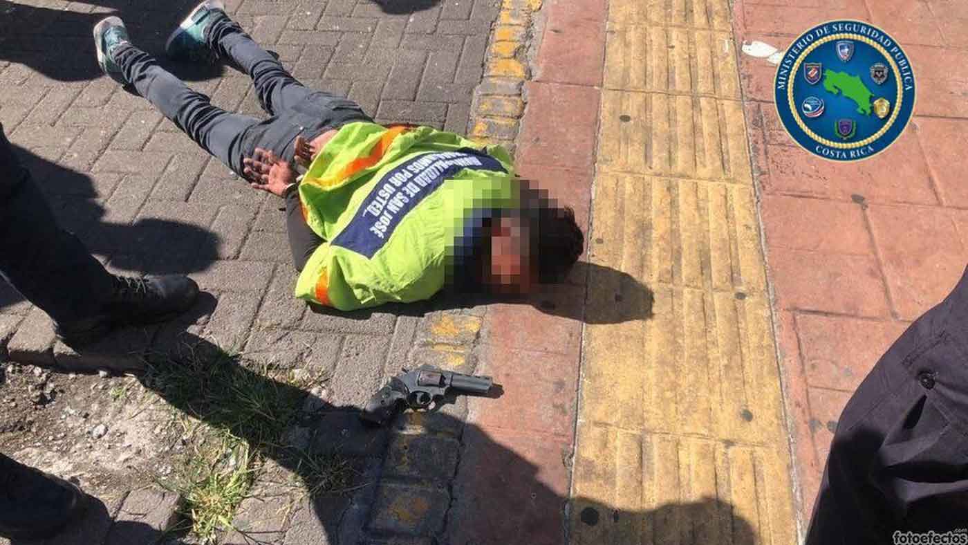 La Policía recibe una alerta de un asalto en San José centro, le indican a los uniformados que un hombre con una camisa de la Municipalidad de San José con un arma de fuego llega y encañona a 2 vendedores de lotería y les roba un maletín, inmediatamente un comando policíal le da persecución logrando alcanzarlo lo encañonan y lo tiran al suelo y lo esposan.