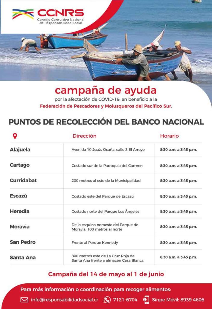 La campaña de recolección se llevará a cabo hasta el 1 de junio, los productos que se requieren son: arroz, frijoles, pasta (macarrones), aceite, azúcar, sal, y café. Y se contará con 8 puntos de recolección de víveres en agencias del Banco Nacional (ver recuadro)