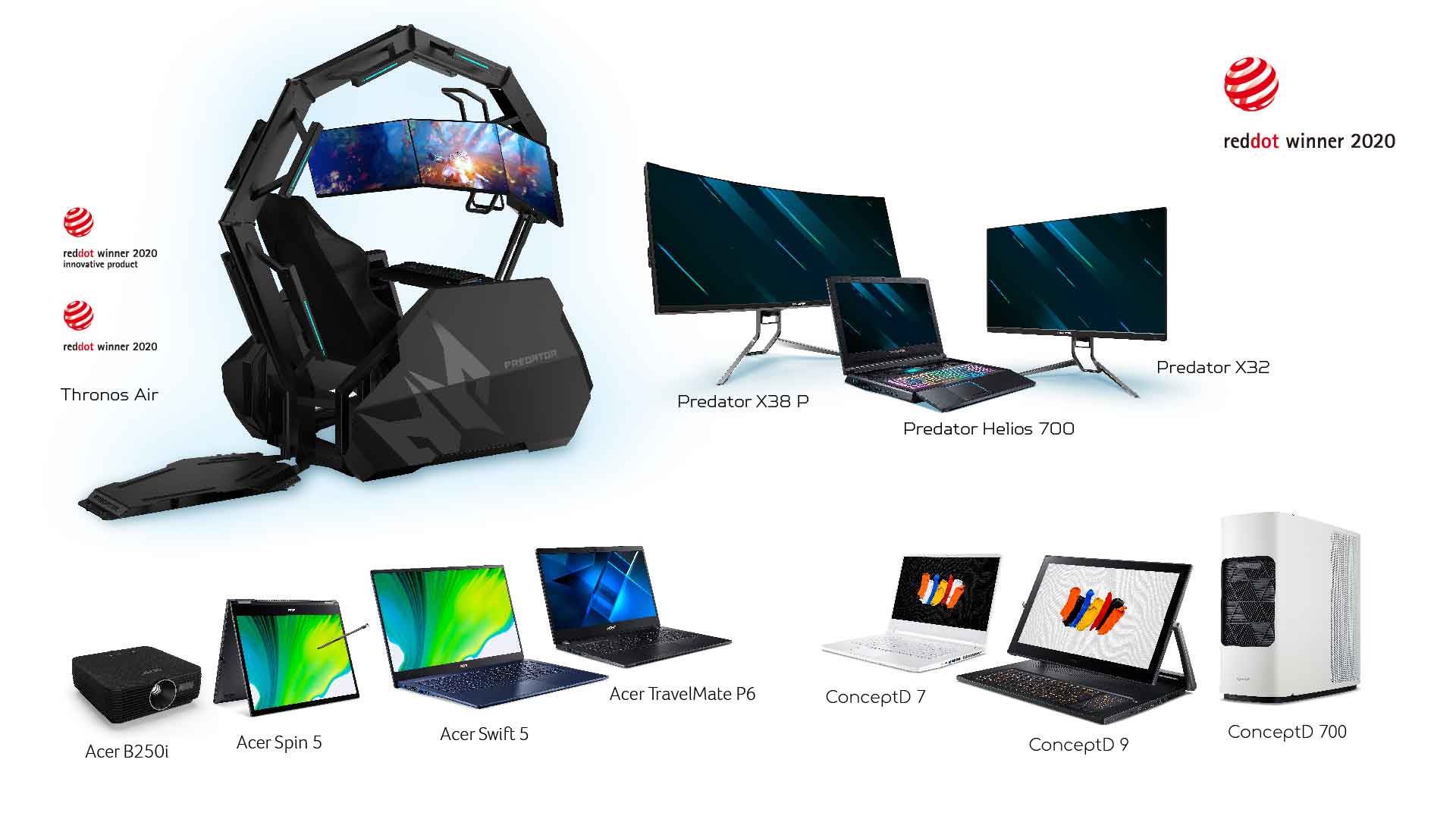 TAIPEI, TAIWÁN (mayo de 2020) Once productos de Acer han obtenido un total de doce Premios Red Dot 2020 por excelencia en productos e innovación en diseño. La línea gaming Predator se llevó la mayor cantidad de premios con su notebook, silla y monitores. La silla gaming Predator Thronos Air también ganó el Premio Red Dot Innovation Products, que se otorga a los productos que establecen nuevos estándares y sientan las bases para un cambio fundamental en la industria [1]. Las desktop y notebooks ConceptD para creadores obtuvieron tres premios, y el resto fue para la gama de notebooks profesionales, delgadas y ligeras de Acer y un proyector.