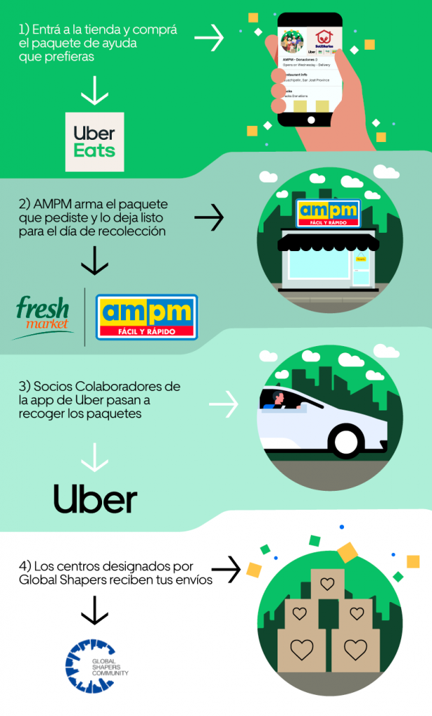 - El socio colaborador registrado en la app de Uber recogerá los paquetes y los trasladará a los centros designados por la Asociación Global Shapers.