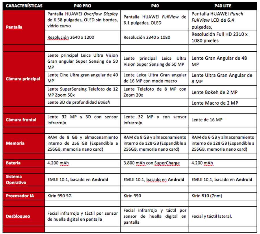 Tabla de especificaciones de la familia HUAWEI P40