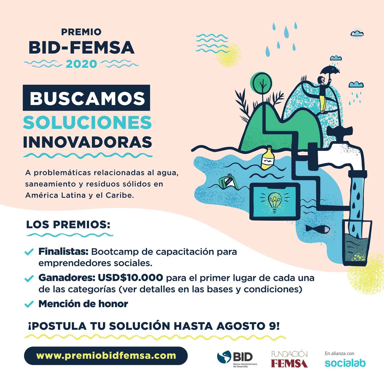 Washington, junio de 2020. El Banco Interamericano de Desarrollo y Fundación FEMSA anunciaron la convocatoria para el Premio BID-FEMSA 2020, que desde 2009 reconoce a las soluciones más innovadoras en los sectores de agua, saneamiento y manejo de residuos sólidos en América Latina.