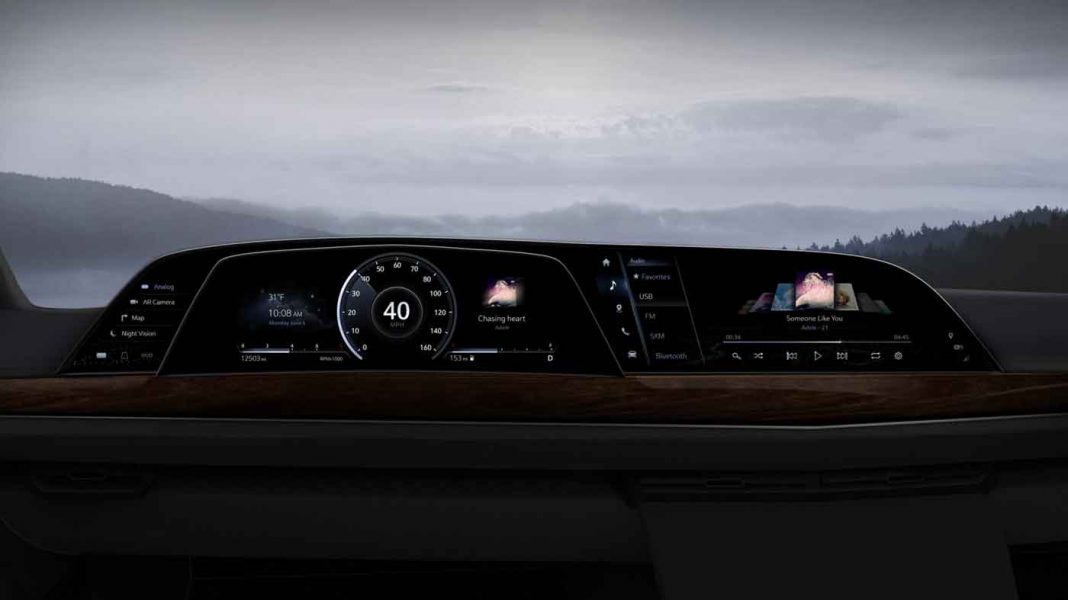 La tecnología de cabina P-OLED en el Cadillac Escalade 2021 no solo actúa como una pieza central impresionante dentro del icónico SUV, sino que también representa la primera vez que la solución avanzada de cabina digital de LG se presenta en un vehículo comercial. La pantalla de 38 pulgadas se compone de tres paneles de pantalla P-OLED separados, el más grande mide 16.9 pulgadas en diagonal.