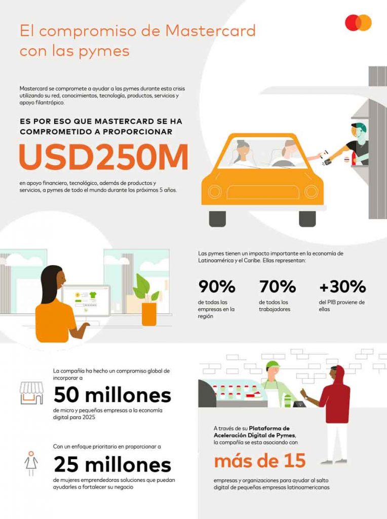 La Plataforma de Aceleración Digital de Mastercard es un componente crítico de la respuesta de la compañía ante el COVID-19, la cual incluye un compromiso de financiación global, un compromiso de inclusión digital, soluciones y servicios gratuitos y MastercardBiz. Como parte de su compromiso para apoyar a las pymes, Mastercard anunció recientemente que introduciría 50 millones de pequeñas empresas, incluyendo 25 millones de mujeres empresarias, en la economía digital para 2025. Además, se comprometió a brindar $250 millones de dólares para apoyar a las pequeñas empresas en todo el mundo en los próximos cinco años.