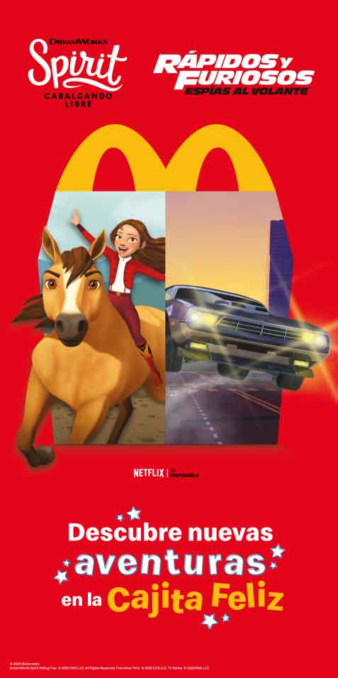 San José, 11 de julio de 2020. Una nueva Cajita Feliz llega a los cerca de 70 restaurantes McDonald’s del país, con 12 entretenidos juguetes de dos series animadas creadas por DreamWorks Televisión, Spirit:Cabalgando Libre y Rápidos y Furiosos:Espías al Volante; y con los que, los más pequeños de la casa podrán crear interminables aventuras galopando a caballo por las llanuras, o corriendo por pistas y calles en auto.