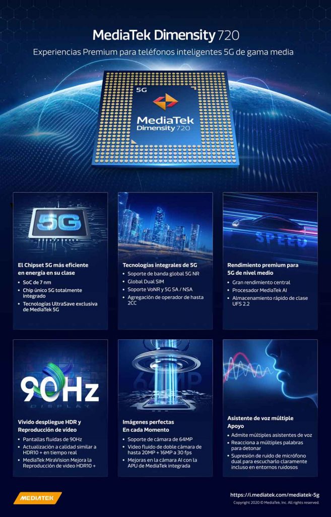 El Dimensity 720 está diseñado para proporcionar una experiencia premium a velocidades de 5G para dispositivos de nivel medio con características que incluyen: