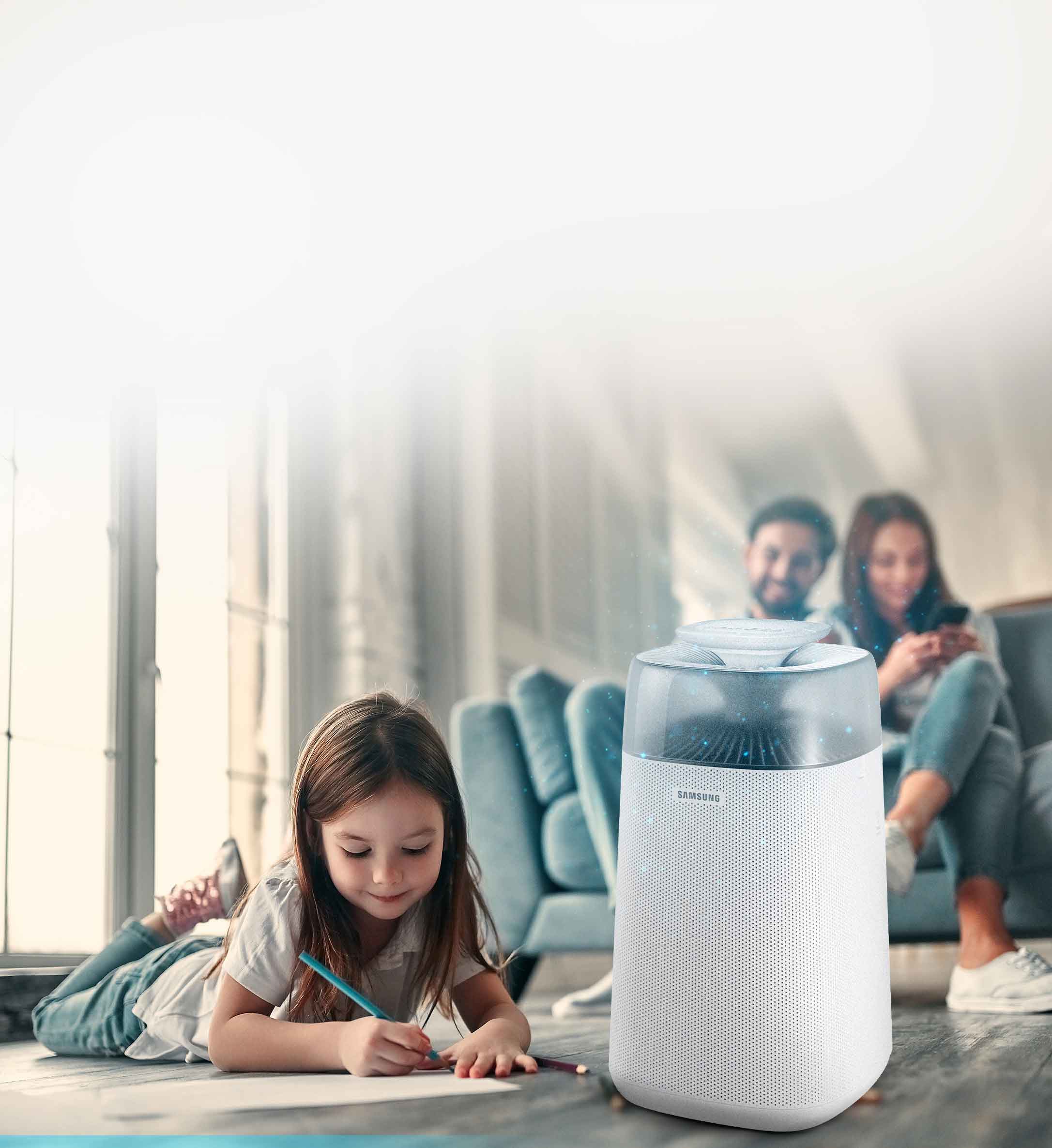 Para cuidar la calidad del aire dentro del hogar, el purificador de aire de Samsung es la solución perfecta. Su filtro HEPA puede recolectar el 99.97% de las nanopartículas de 0.3㎛ (micrómetro), algunas de las más difíciles de atrapar, antes de que tengan la oportunidad de circular en su hogar. Además, el purificador de aire puede eliminar eficazmente el polen y otras partículas ultrafinas que causan enfermedades respiratorias o alergias y también ayuda a eliminar numerosos tipos de olores y gases nocivos.