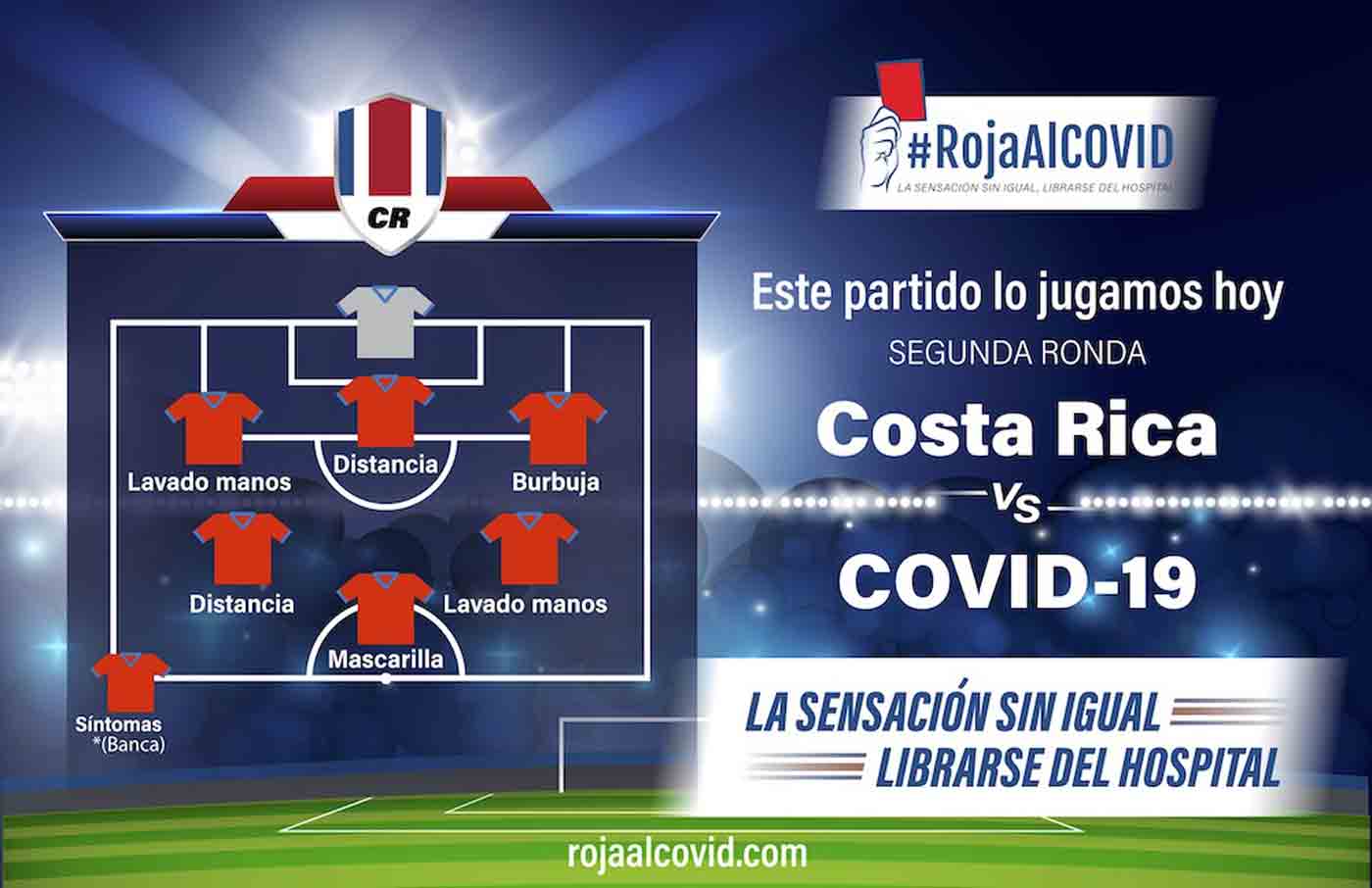 Costa Rica, 1 de octubre 2020. La campaña #RojaAlCovid: La Sensación sin igual, librarse del hospital hace un llamado a la población para ganar este partido contra el Covid-19 a pura defensa; el objetivo es persuadir a las personas, especialmente a las poblaciones con mayor vulnerabilidad ante el contagio del Covid-19 a extremar las medidas en todo momento y lugar para controlar la curva y recuperar la economía.