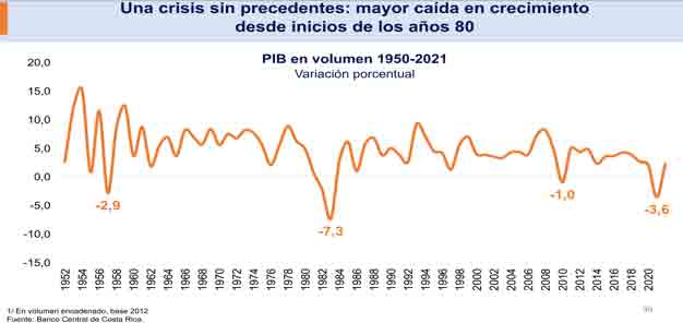 Diferentes previsiones aseguran que la economía sufrirá una contracción del PIB. Una de ellas es la anunciada por el Banco Central de Costa Rica, que prevé una caída del 3,6% del PIB, la mayor desde inicios de los años 80”.[1]