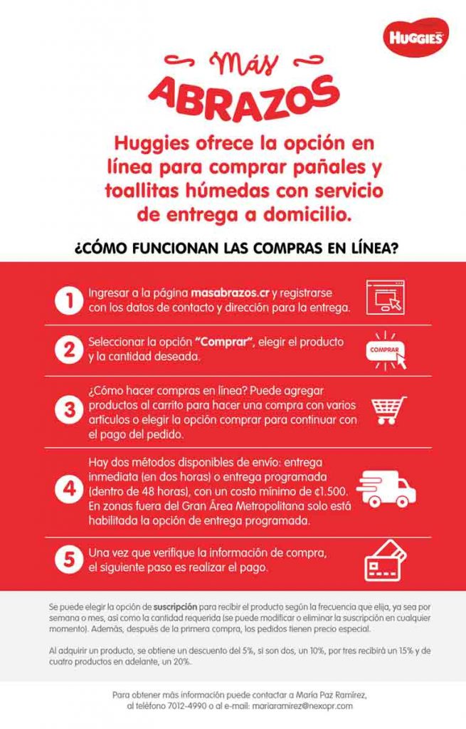 Entrega a domicilio. Como alternativa ante el contexto actual que vivimos, Huggies® habilitó en el sitio masabrazos.cr la opción de comprar producto y coordinar la entrega a domicilio.