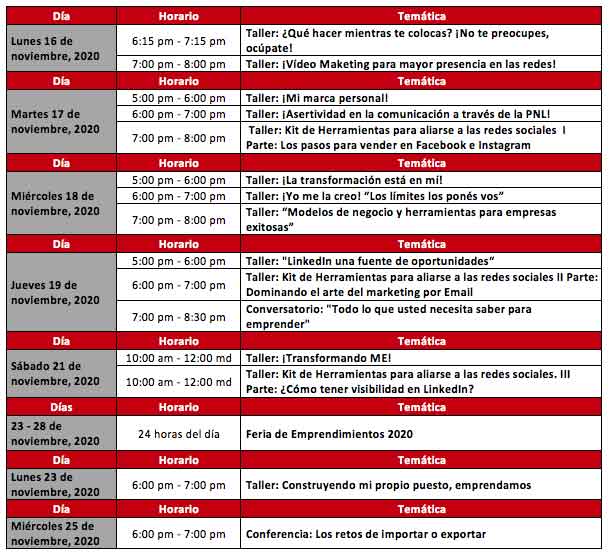 Dentro de los talleres y conversatorios – con expositores nacionales e internacionales de alto renombre – se ofrecen temas de impacto para todas las personas en búsqueda de una oportunidad laboral y; además, de quienes deseen emprender de forma exitosa y creativamente sus modelos de negocios.