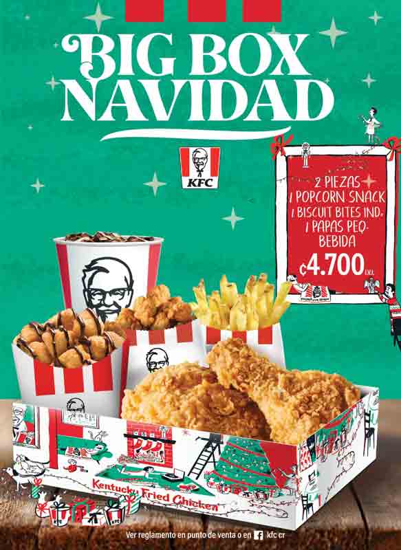 Es por ello, que desde este 16 de noviembre los clientes de KFC podrán disfrutar del mejor pollo con la llegada de sus tradicionales productos navideños: Mega Navidad (12 piezas de pollo, 2 acompañamientos mega y 1 biscuit bites, producto especial de temporada) a ₵13.990 y el Big Box Navidad (2 piezas de pollo, 1 popcorn snack, 1 biscuit bites individual, 1 papa pequeña y 1 bebida) por solo ₵4.700.
