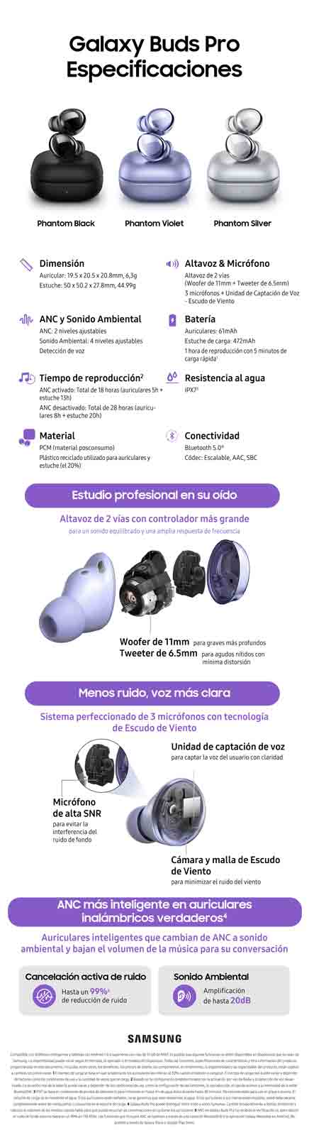 Los Galaxy Buds Pro se han creado para proporcionar experiencias de sonido verdaderamente integrales e inteligentes, con una gama de innovaciones y funcionalidades diseñadas para la forma en que usa sus auriculares hoy en día: para trabajar, para jugar y para todo lo demás. La batería de larga duración de Galaxy Buds Pro, la clasificación de resistencia al agua IPX7, el diseño ajustado para un uso diario óptimo y más, están aquí para ayudarlo a que sus experiencias de audio diarias sean más épicas.