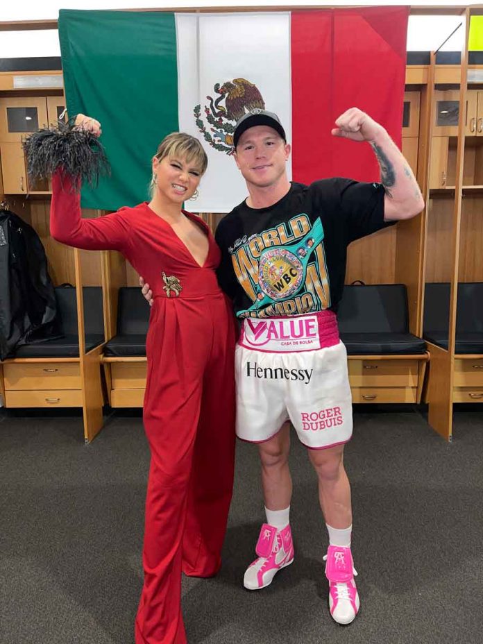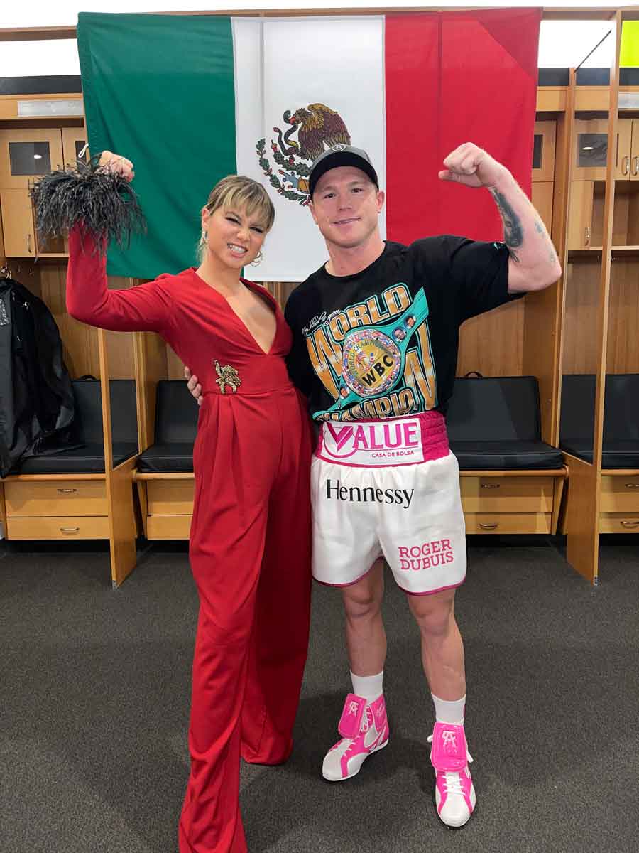 Sofía Reyes: «Primero que nada estoy completamente agradecida por esta oportunidad, con Canelo por haberme invitado, es un honor para mi cantar el Himno Nacional Mexicano, estaba muy nerviosa porque es algo sumamente importante para mi respetar a mi país Mexico y mi bandera. Fue una noche muy especial. Una experiencia nueva, y me encantó conocer a Saúl en persona. Espero esta no sea la última vez”.