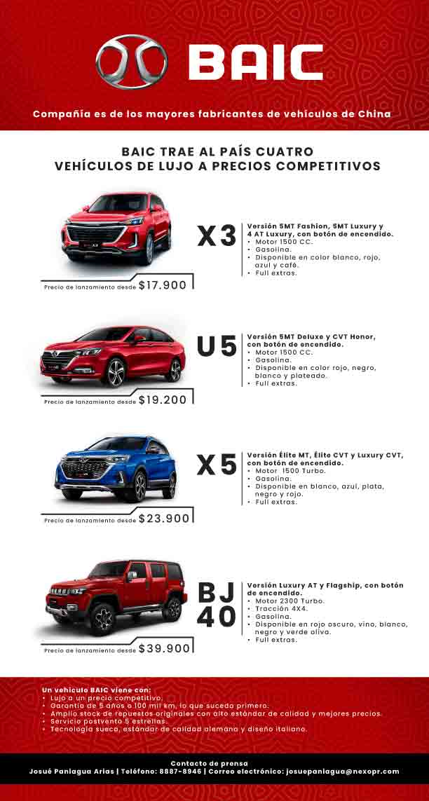 “En China, BAIC es reconocida como la marca 4×4 del país, por lo que esperamos que los ticos puedan disfrutar de este poderoso auto que se adapta a cualquier terreno ya sea en playa o montaña y que también permite lucir elegante en la ciudad”, comentó Daniel De Bedout, gerente de marca BAIC Costa Rica.