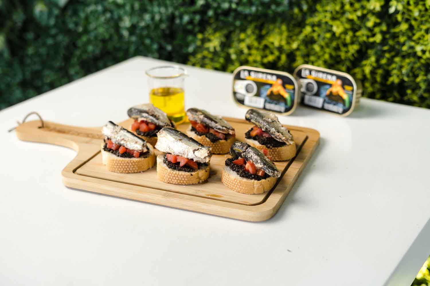 •  En rodajas de pan baguette tostado, untar el paté de aceitunas, colocar tomate en cuadritos y finalizar colocando una sardina en aceite La Sirena®