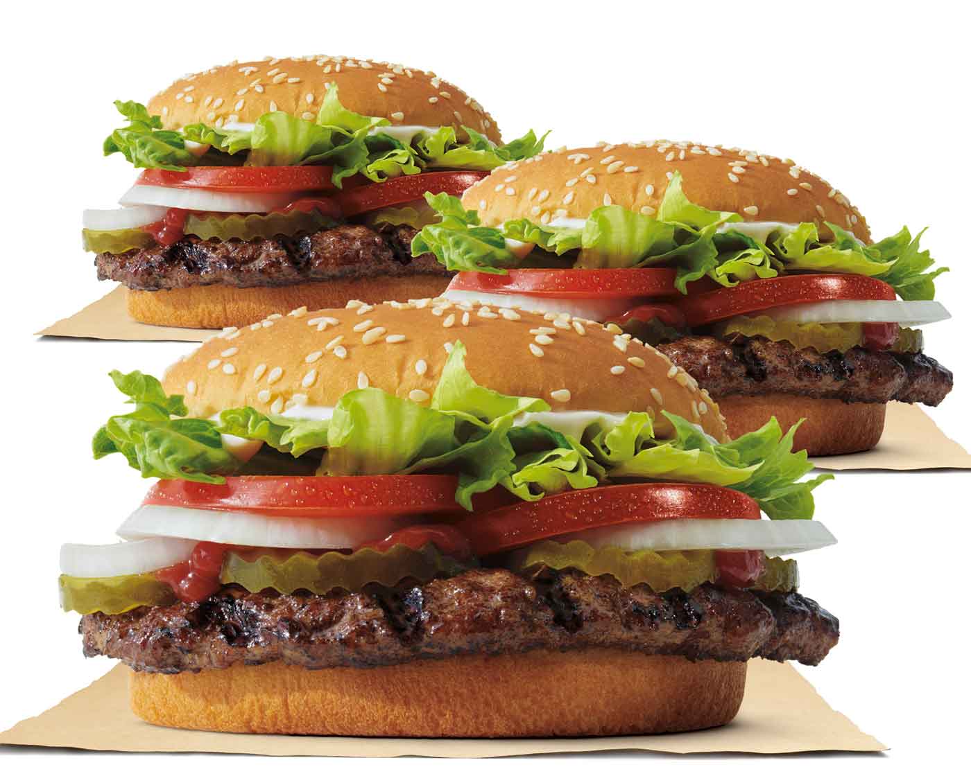 Adicionalmente, el 3 x 1 aplica exclusivamente para el Whopper Clásico en su receta original; es decir, no aplican modificaciones al producto, como agregar o remover ingredientes.