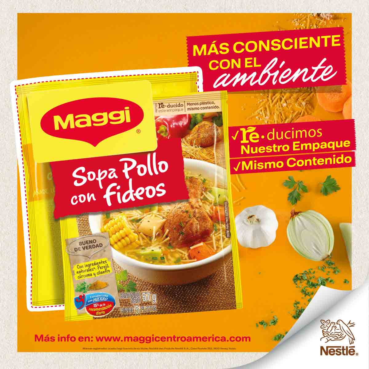 Como parte de este esfuerzo, MAGGI lanza la campaña MMMM: “Menos empaque, Mismo contenido, Más ingredientes naturales y Más consciente con el ambiente”.  Como parte de esta campaña, los empaques de sopas y cremas MAGGI fueron RE.diseñados  para  disminuir la cantidad de plástico utilizada, pero incluyendo el mismo contenido de producto, el sabor y la calidad de siempre.