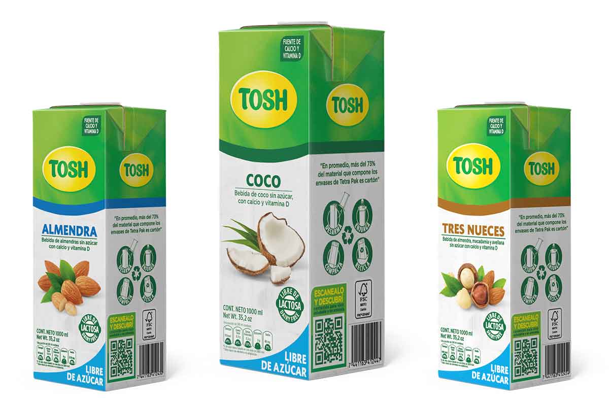 A partir del mes de julio podrá probar la nueva categoría de bebidas vegetales Tosh de almendra, coco y tres nueces (almendras, macadamias y avellanas), fortificadas para ser fuente de calcio y vitamina D, libres de lactosa, conservantes y azúcar, no contienen colorantes ni saborizantes artificiales.