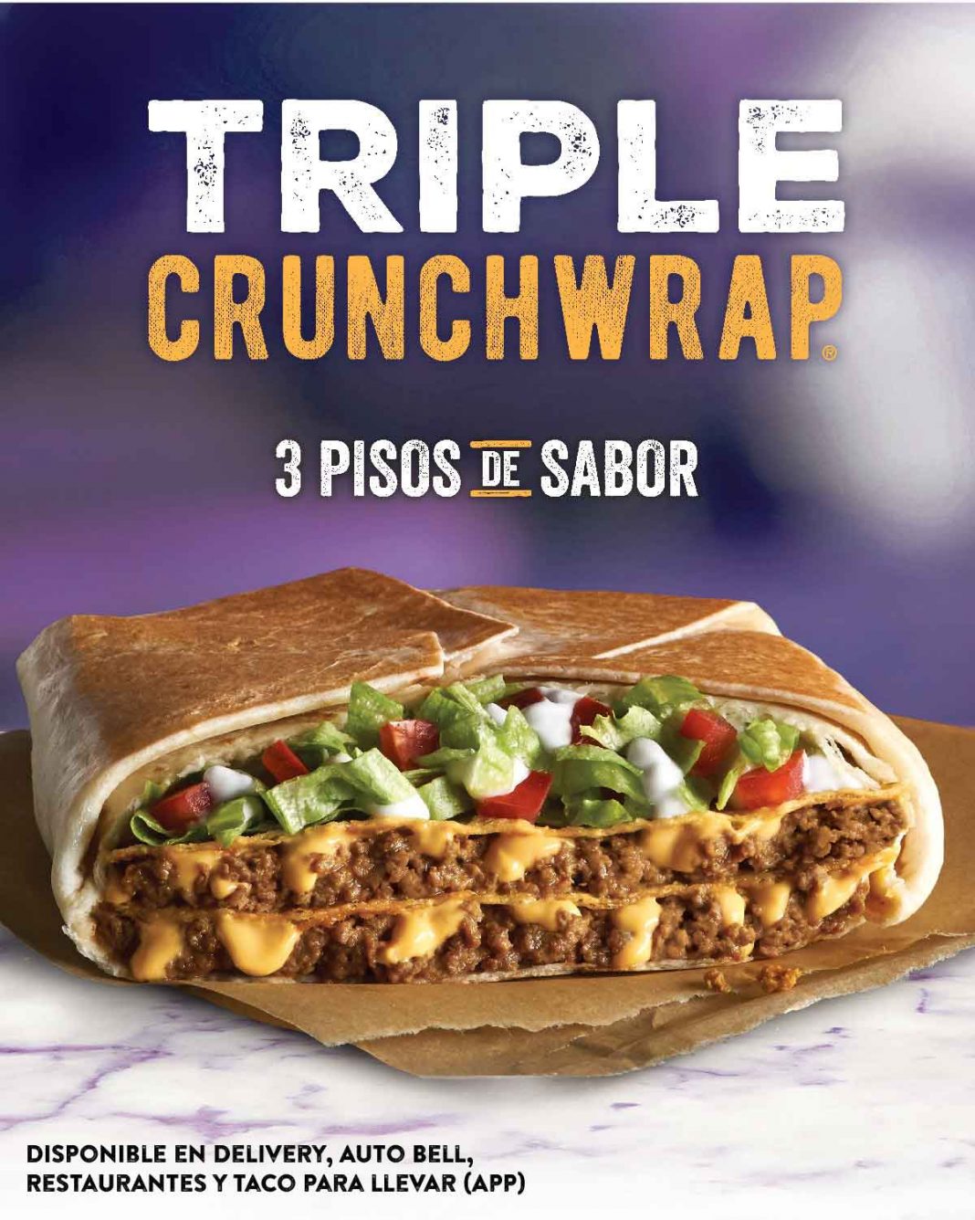 La Triple Crunchwrap destaca por sus tres pisos de sabor y se conforma por una doble porción de deliciosa carne sazonada entre dos crujientes tortillas, combinada con salsa de queso, lechuga, tomate y natilla, envueltos por una caliente tortilla.