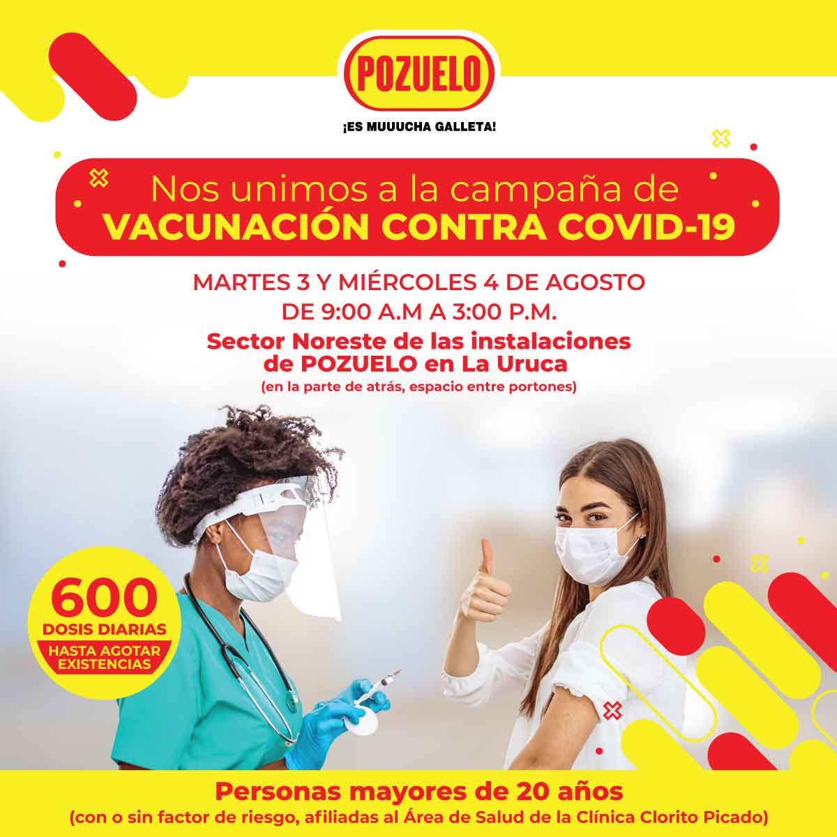 Pozuelo se une a la jornada de vacunación contra el COVID-19, este martes 3 y miércoles 4 de agosto, de 9:00 a.m. a 3:00 p.m., en el Sector Noreste de las instalaciones de Pozuelo, en La Uruca (en la parte de atrás, espacio portones).