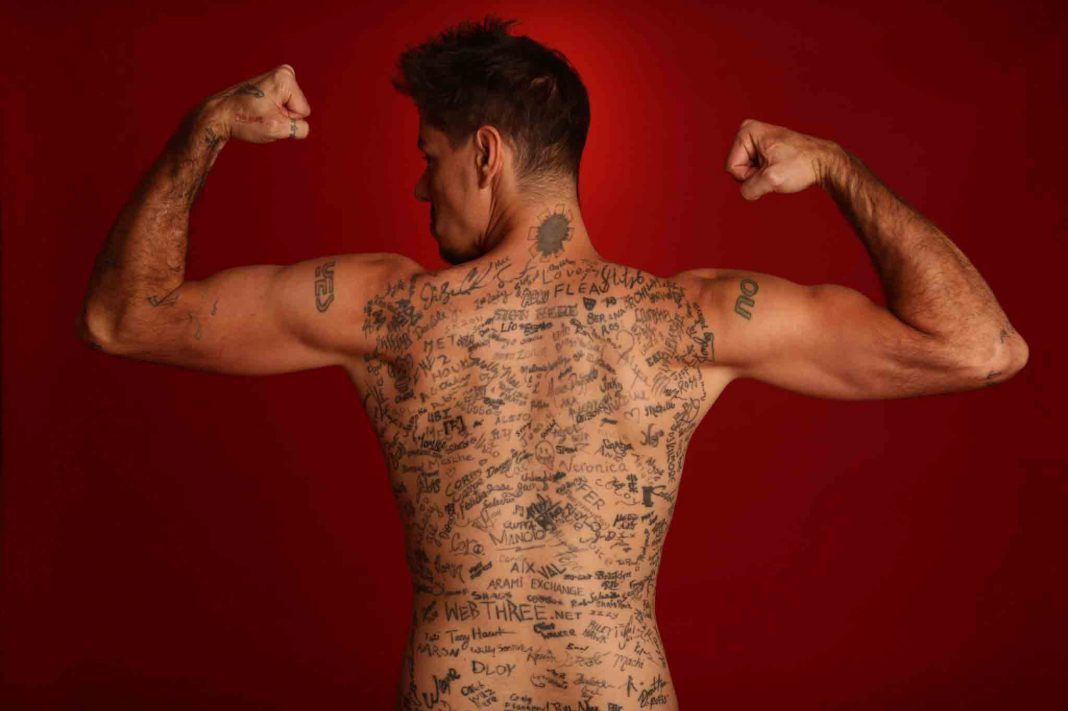 Sobre las firmas en su espalda, nos comenta “El récord mundial fue inesperado. Nunca fue mi intención romper un récord con este proyecto. Simplemente quería que la gente más cercana en mi vida me tatuara la espalda con su firma. Y poco a poco se fue expandiendo la idea y se unieron muchísimas personas importantes”.