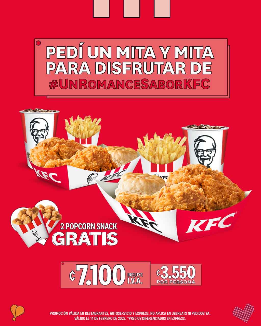 El restaurante de comida rápida, KFC pensó en esto y quiere invitar a todos sus clientes a celebrar este día con sabor a KFC, ya que durante el 14 de febrero el combo Mita y Mita estará a tan solo 7100 colones, 3 550 colones por persona, para que lo puedan compartir con su persona favorita. El combo incluye 4 piezas de pollo, 2 papas, 2 bebidas, 2 biscuit, y por este día como obsequio te entregarán 2 popcorn snack gratis.