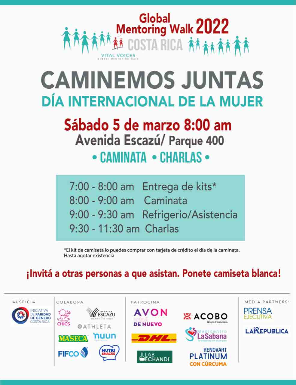 Marzo 2022. En conmemoración del Dia Internacional de la Mujer, cientos de mujeres caminaran por las calles de Escazú el próximo sabado 5 de marzo. La actividad se organiza en el marco de celebración del Global Mentoring Walk 2022 y tiene como objetivo hacer un llamado para abrir camino a las mujeres del mundo, en un espacio que permitirá a la Fundación Voces Vitales Costa Rica recaudación de fondos.