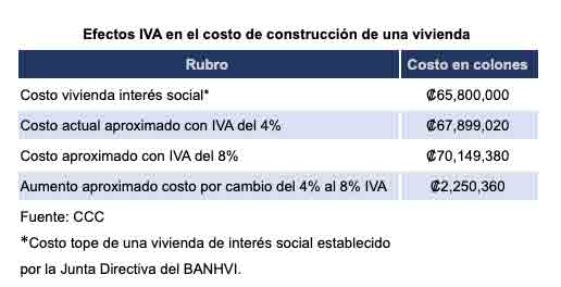 Estimaciones realizadas por la CCC muestran que el ajuste en el IVA generará un aumento de costo de una vivienda de interés social de ₡2.250.360 (Ver detalle).