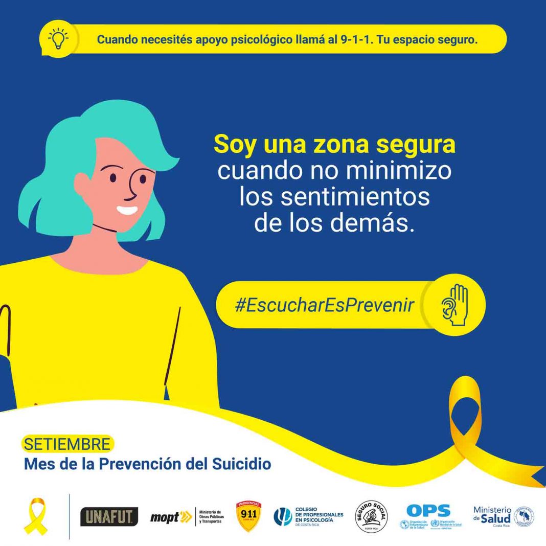 Por ello, y con el fin de continuar impulsando acciones que permitan disminuir estos lamentables hechos, el Ministerio de Salud, la Organización Panamericana de la Salud/ Organización Mundial de la Salud – Sede Costa Rica (OPS/OMS), la Caja Costarricense de Seguro Social (CCSS), el Colegio de Profesionales en Psicología de Costa Rica (CPPCR) y el Sistema de Emergencias 9-1-1, entre otras instituciones, hacen un llamado a la comunidad costarricense sobre “Escuchar es prevenir”, mediante una campaña de comunicación durante todo este mes de setiembre.