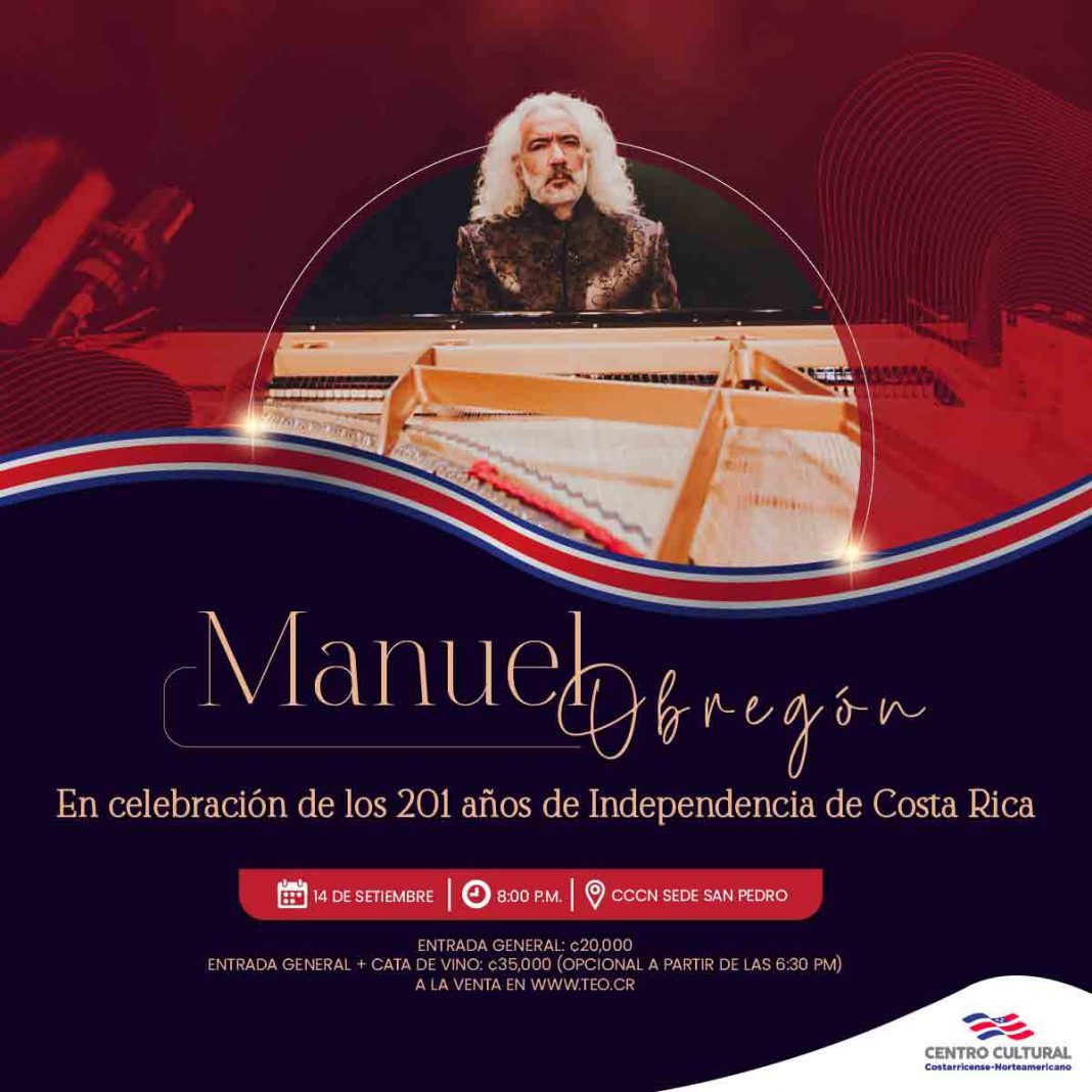 Setiembre, 2022. Manuel Obregón, pianista, compositor y productor costarricense y el CCCN celebrarán la independencia con un concierto íntimo, este 14 de setiembre a las 8:00 p.m., en el Centro Cultural Costarricense Norteamericano.