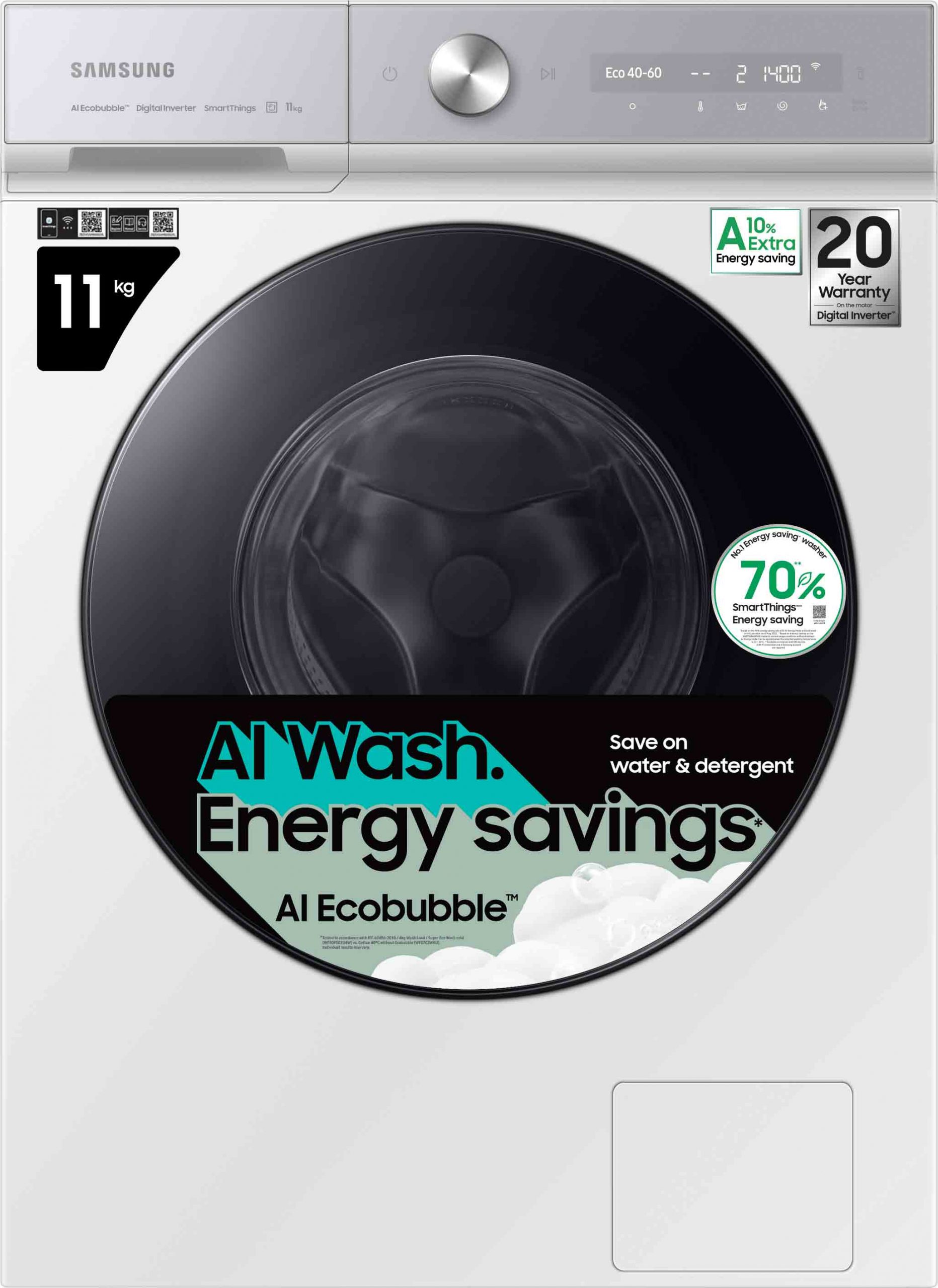 Además de una experiencia de lavado sostenible, la tecnología SpaceMax™ ofrece una amplia capacidad de 11 kilogramos para que los usuarios puedan lavar cargas de ropa más grandes, pero menos veces, lo que reduce los ciclos generales de lavado y secado a largo plazo. SmartThings Energy con AI Energy Mode[4]optimiza los ciclos de lavado con tecnologías como Ecobubble™, que reduce el uso de energía al brindar una limpieza poderosa con agua fría[5] sin tener que calentar el agua.