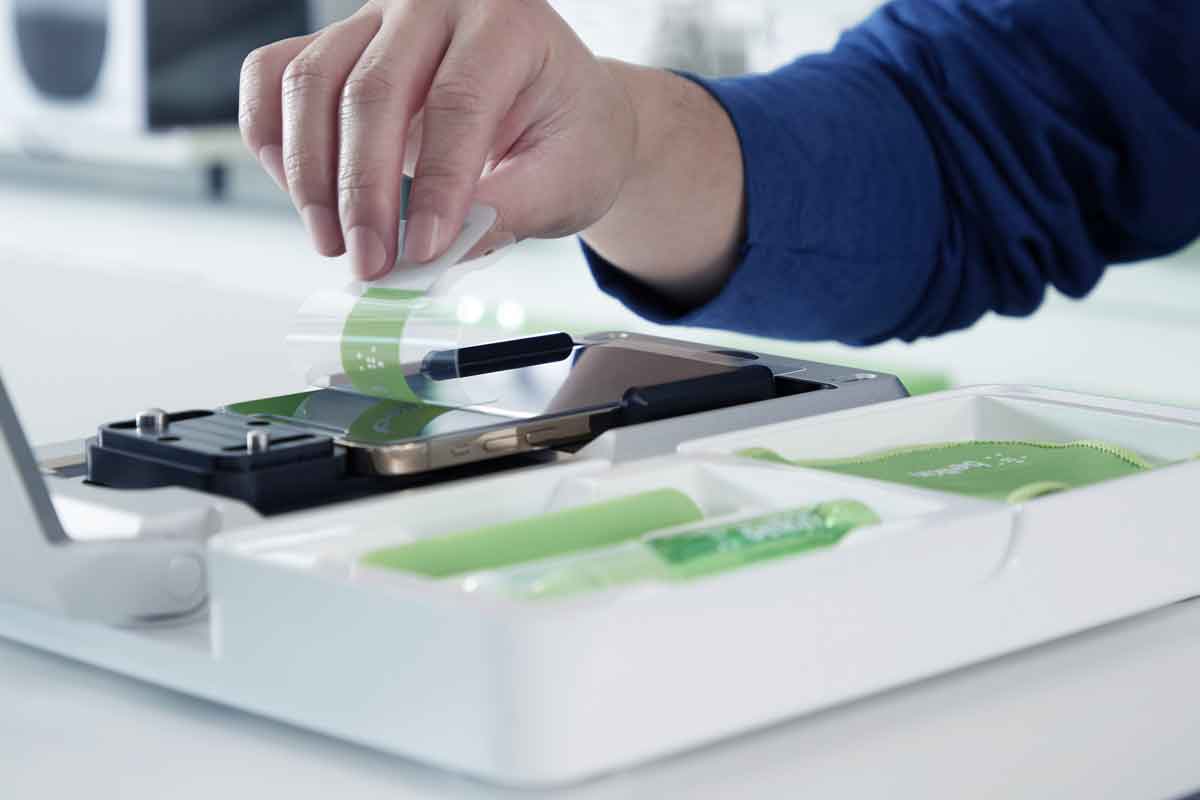 Los dispositivos móviles son herramientas que no sólo mantienen a las personas conectadas con sus amigos o seres queridos, sino que también se han convertido en una herramienta de trabajo. Sobre todo, conservarlo es especialmente importante en caso de que el usuario quiera vender el equipo en el futuro. Esto incluye mantenerlo limpio, sin abolladuras, ni golpes y, sobre todo, mantener la pantalla intacta. Para evitar estos problemas, la tecnología que ofrece el sistema de aplicación SCREENFORCE PRO va acompañada de personal cualificado en la tienda que puede limpiar, alinear y colocar la pantalla con gran precisión para que el usuario pueda aprovechar al máximo sus ventajas.