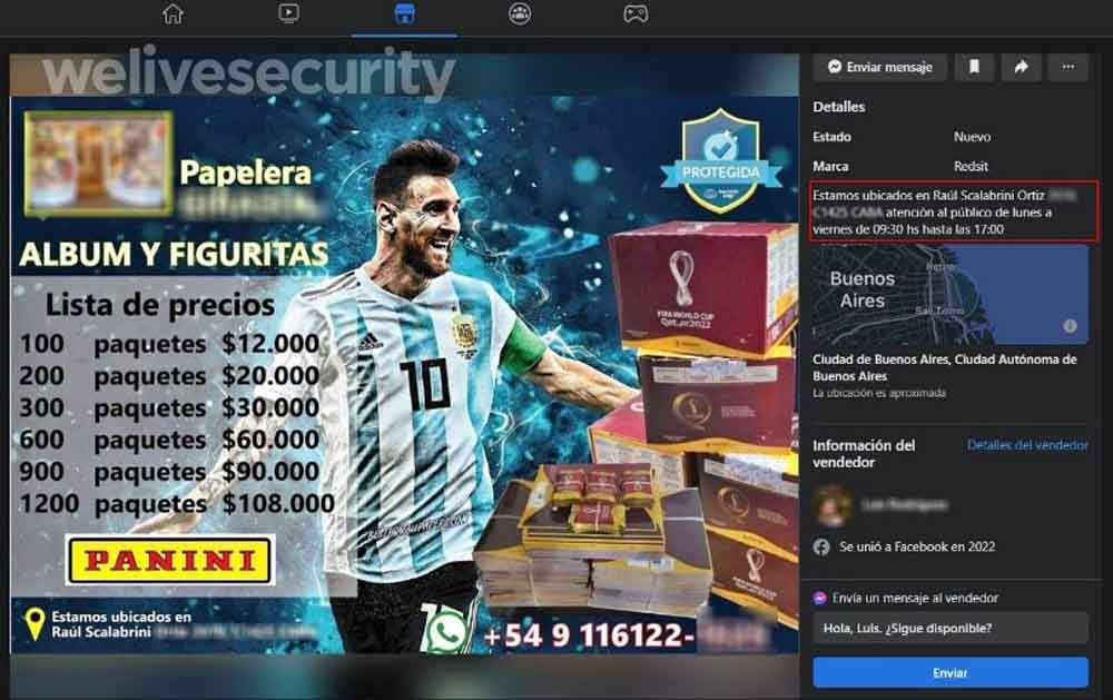 Centroamérica, 02 de noviembre de 2022. Desde ESET, compañía líder en detección proactiva de amenazas, analizan el caso reciente de un comercio que se vio involucrado, sin saberlo, en una estafa vinculada con el álbum de figuritas de la Copa del Mundo. Los estafadores están utilizando el nombre, la dirección física del comercio y las imágenes que figuran en Google Maps para crear un falso perfil en Marketplace y ofrecer figuritas a un precio atractivo, con el objetivo de robar el dinero de las víctimas.