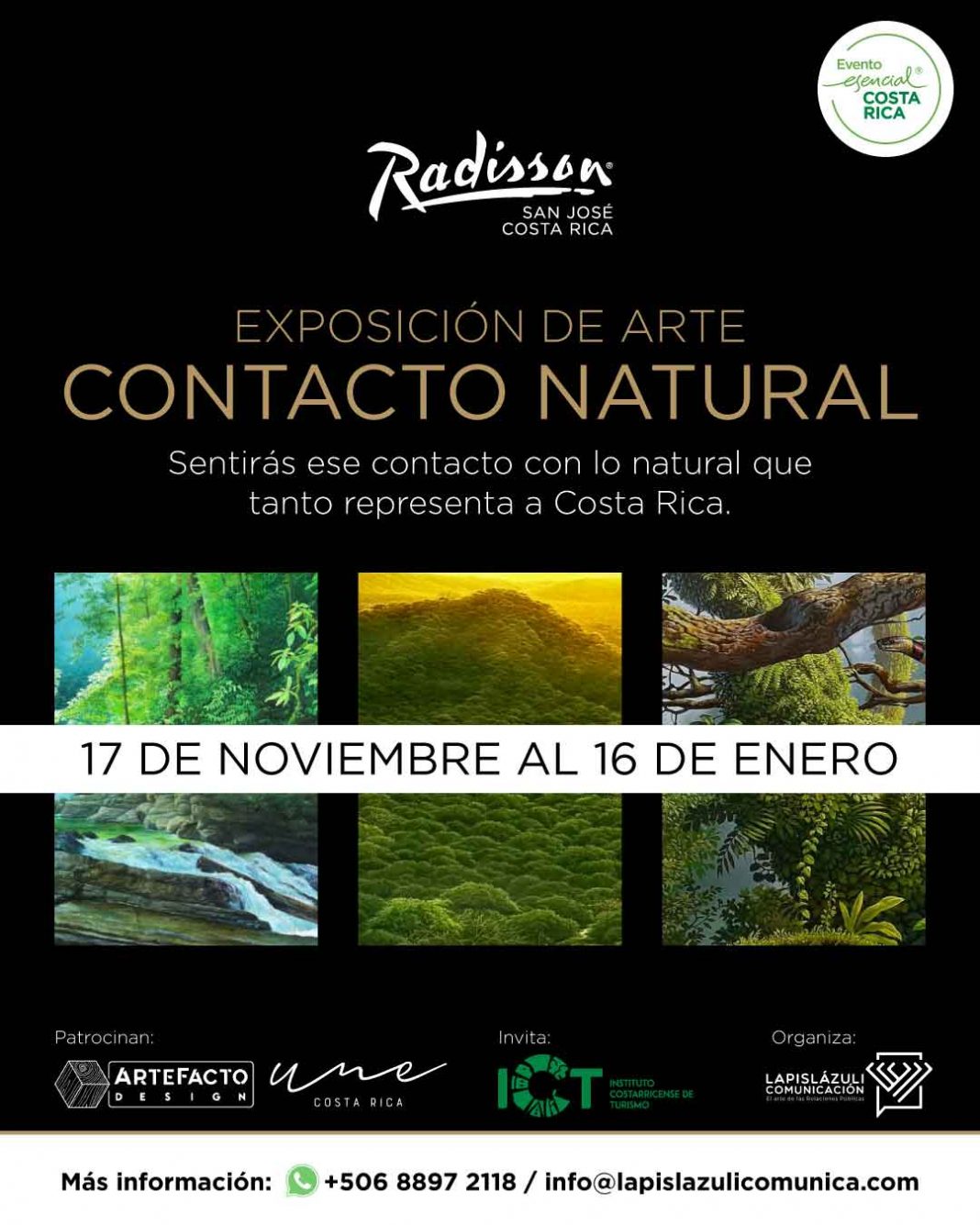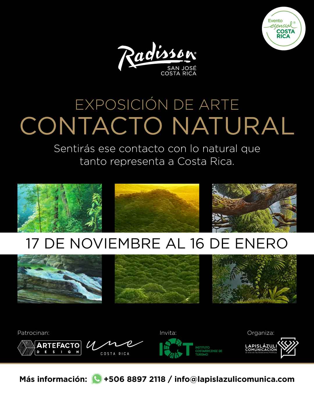 El Hotel Radisson San José en donde se desarrollan continuamente eventos sociales con colaboraciones musicales, danza y teatro, da un nuevo paso, este mes de noviembre, específicamente del 17 de noviembre al 16 de enero, será sede de “Contacto Natural”, exposición de arte organizada por Lapislázuli Comunicación, agencia de comunicación y relaciones públicas que enfoca esfuerzos en promoción de arte.