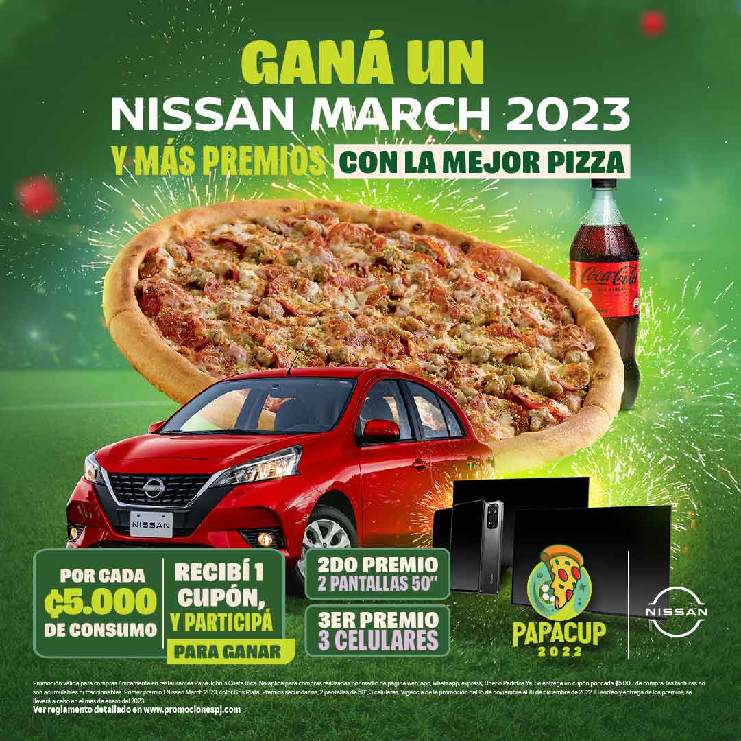 Papa John´s se viste de rojo y se alinea con una serie de dinámicas para todos los aficionados de la pizza y del fútbol. Una rifa de un Nissan March 2023, pantallas y celulares, ruletas con premios, gramillas sintéticas, futbolines, música, decoración y una variada grilla de productos (pizza, desayunos, combos familiares) serán parte de esta experiencia Papa Cup.