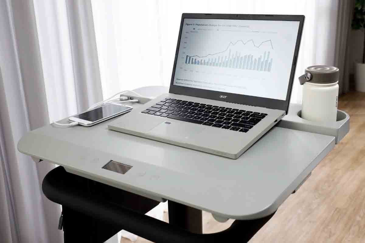 El escritorio multifunción para bicicletas cuenta con dos puertos USB tipo A y un puerto USB tipo C, lo que permite cargar varios dispositivos móviles a la vez. Un indicador LED de carga en la parte trasera de la bicicleta se enciende al pedalear, lo que indica que se está convirtiendo la energía cinética. La amplia superficie del escritorio de eKinekt brinda al usuario un amplio espacio de trabajo, mientras que la altura de la mesa y el asiento ajustables le permiten sentarse en una posición cómoda en todo momento. Para mayor comodidad, está diseñado con un gancho para bolsas que permite a los usuarios colgar fácilmente sus pertenencias y un soporte para bebidas designado para mantenerse hidratado y evitar derrames cuando está en la bicicleta.