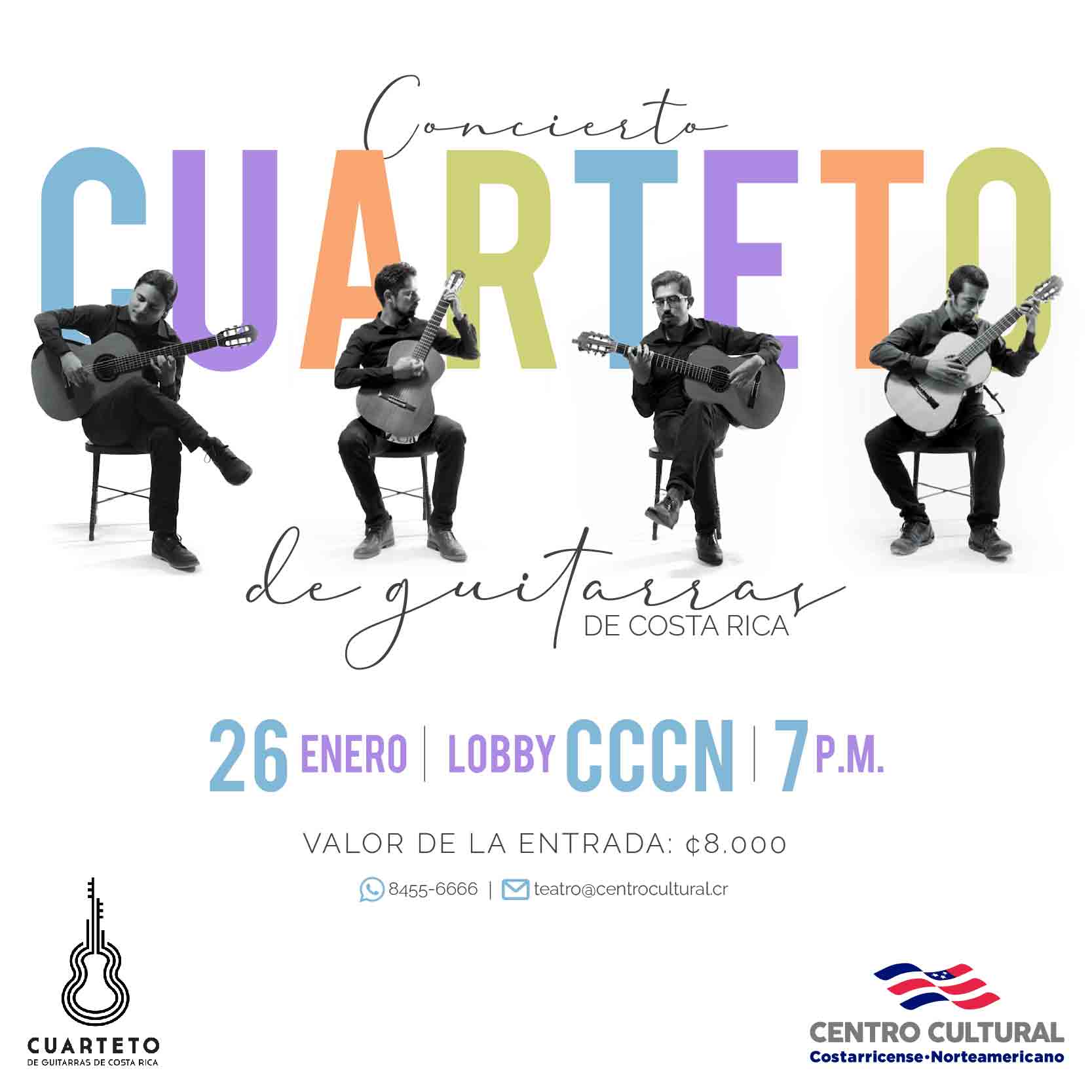El 26 de enero a las 07:00pm podrá asistir a, Cuarteto de Guitarras de Costa Rica, el cual se realizará en un espacio intimo en el lobby del CCCN, presentarán el programa que compartirán en el Royal Opera House Muscat (ROHM) en Omán, principalmente compuesto por música de compositores costarricenses, así como una selección de obras latinoamericanas y de dos compositores norteamericanos.