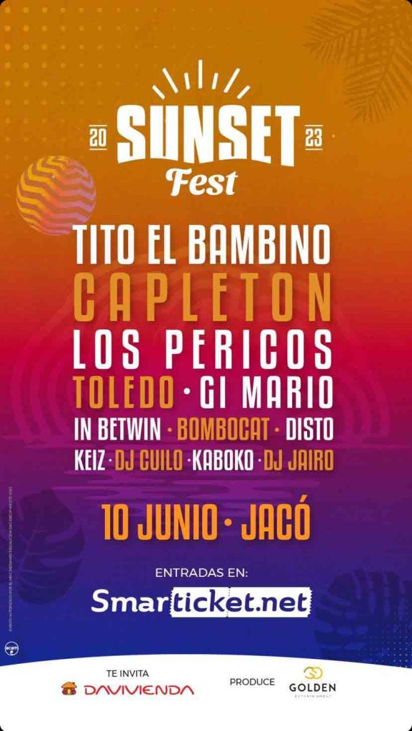 San José, Costa Rica. 14 de marzo, 2023. Si duda, el mejor plan siempre será escaparse un día a la playa, relajarse, participar de muchas actividades y disfrutar del atardecer con un festival musical frente a la playa. Y mejor aún si disfrutamos del mejor talento nacional y tres reconocidos artistas internacionales, como lo son: Tito el Bambino, Los Pericos y Capleton. Esto es lo que promete la primera edición del Sunset Fest 2023, que se realizará el próximo sábado 10 de junio en Jacó, Puntarenas.