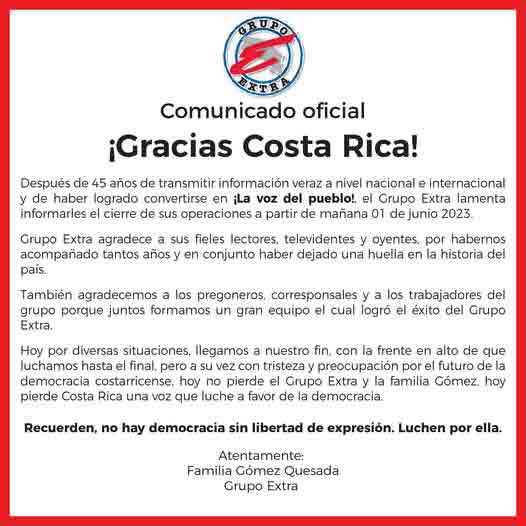 Lamentablemente se anuncio el cierre definitivo del medio de comunicación Diario Extra. La noticia se hizo la tarde de este 31 de mayo, en las redes sociales de dicho diario.