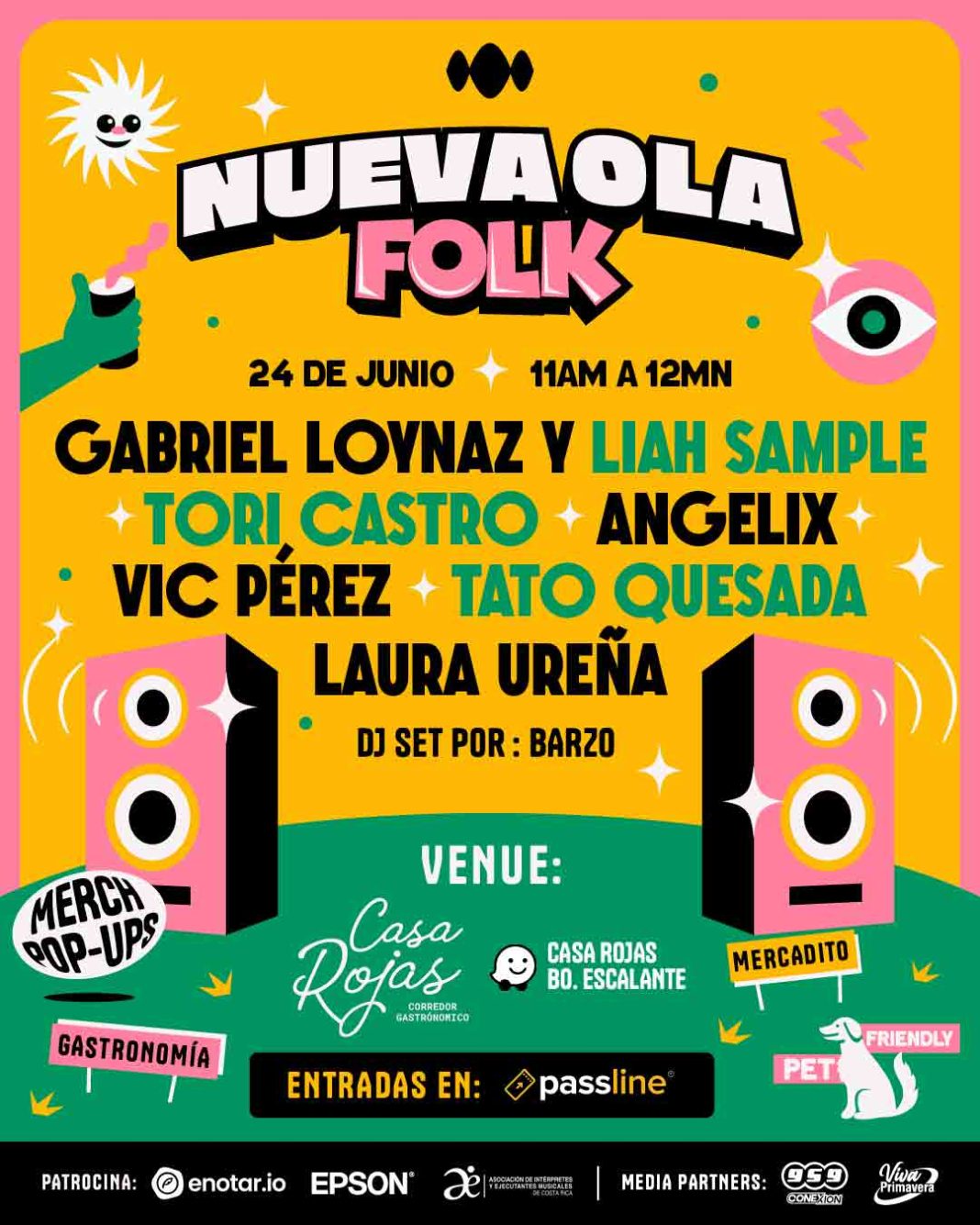 El primer evento llamado Nueva Ola Folk será el día sábado 24 de junio en Casa Rojas, Barrio Escalante y las entradas ya están a la venta en Passline.com, tendrán un costo de ¢10,000 en preventa y ¢12,000 el día del evento. El evento es apto para toda la familia y Pet Friendly. El lineup está compuesto por los artistas: Vic Pérez, Laura Ureña, Tori Castro, Tato Quesada, Gabriel Loynaz + Liah Sample y Angelix.