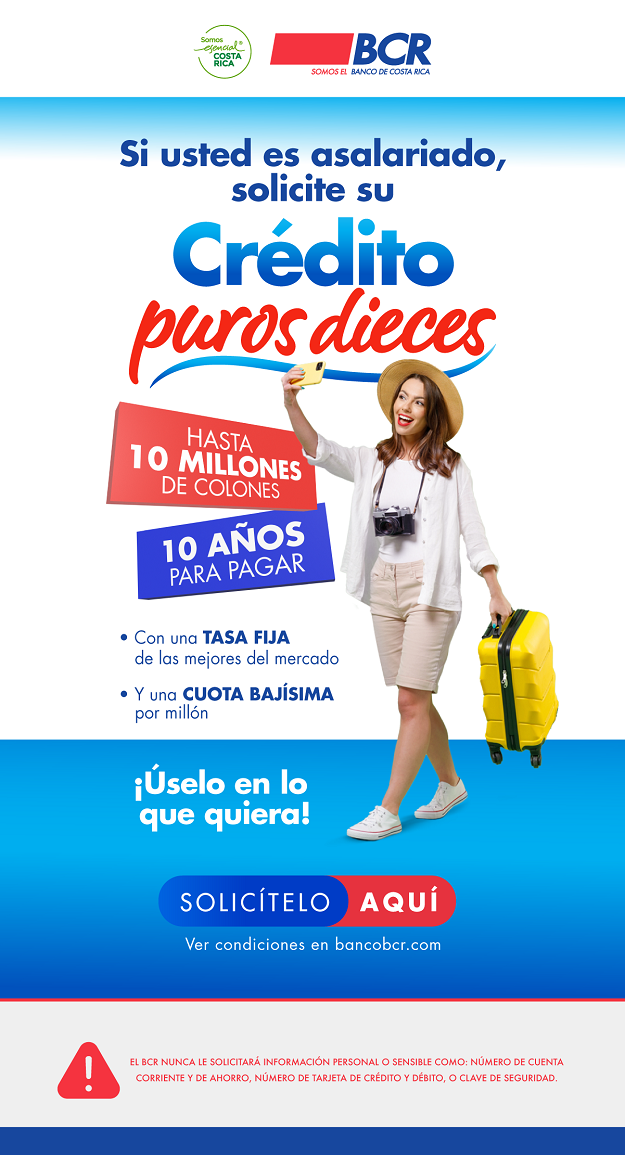 Con el objetivo de continuar diversificando su portafolio de crédito, adecuándolo a los diferentes requerimientos de los clientes, el Banco de Costa Rica (BCR) pone a disposición su nueva oferta de financiamiento para personas físicas: “Puros Dieces”.